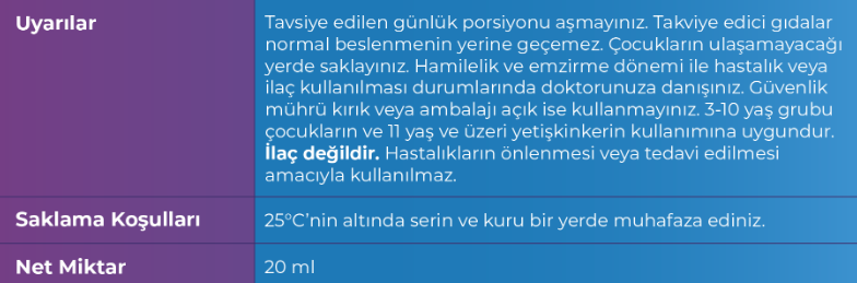 3-10 yaş çocuklar için, günlük 1-2 ölçeğin; 11 yaş ve üzeri yetişkinler için, günlük 3-4 ölçeğin tok karnına tüketilmesi önerilir (1 ölçek=1ml). Kullanmadan önce iyice çalkalayınız. Damlalığı belirtilen miktarda doldurunuz. Direkt ağız içine ya da oda sıcaklığındaki su, süt, yiyecek veya meyve suyuna damlatarak tüketiniz. Açıldıktan sonra 30 gün içerisinde tüketiniz.