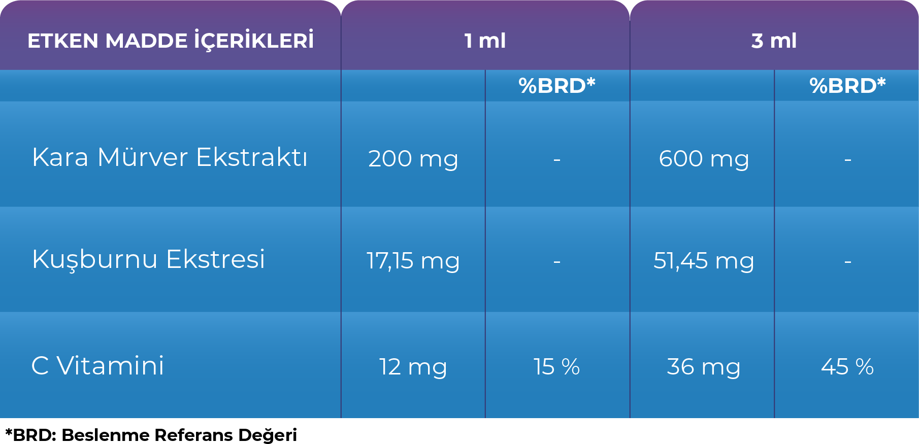 Su, Fruktoz, Kara Mürver Ekstraktı, Kuşburnu Ekstresi (C Vitamini), Koruyucu: Potasyum Sorbat.